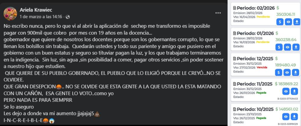 Ariela reveló además que ya se le encuentra vencida la boleta de diciembre —cuyo pago ya le había representado un esfuerzo—, lo que agrava aún más su delicada situación financiera. Con una mezcla de indignación y sarcasmo, la docente publicó una captura de pantalla del monto a pagar y lanzó una pregunta directa al gobernador Leandro Zdero: “¿Qué quiere de nosotros los docentes?”.
