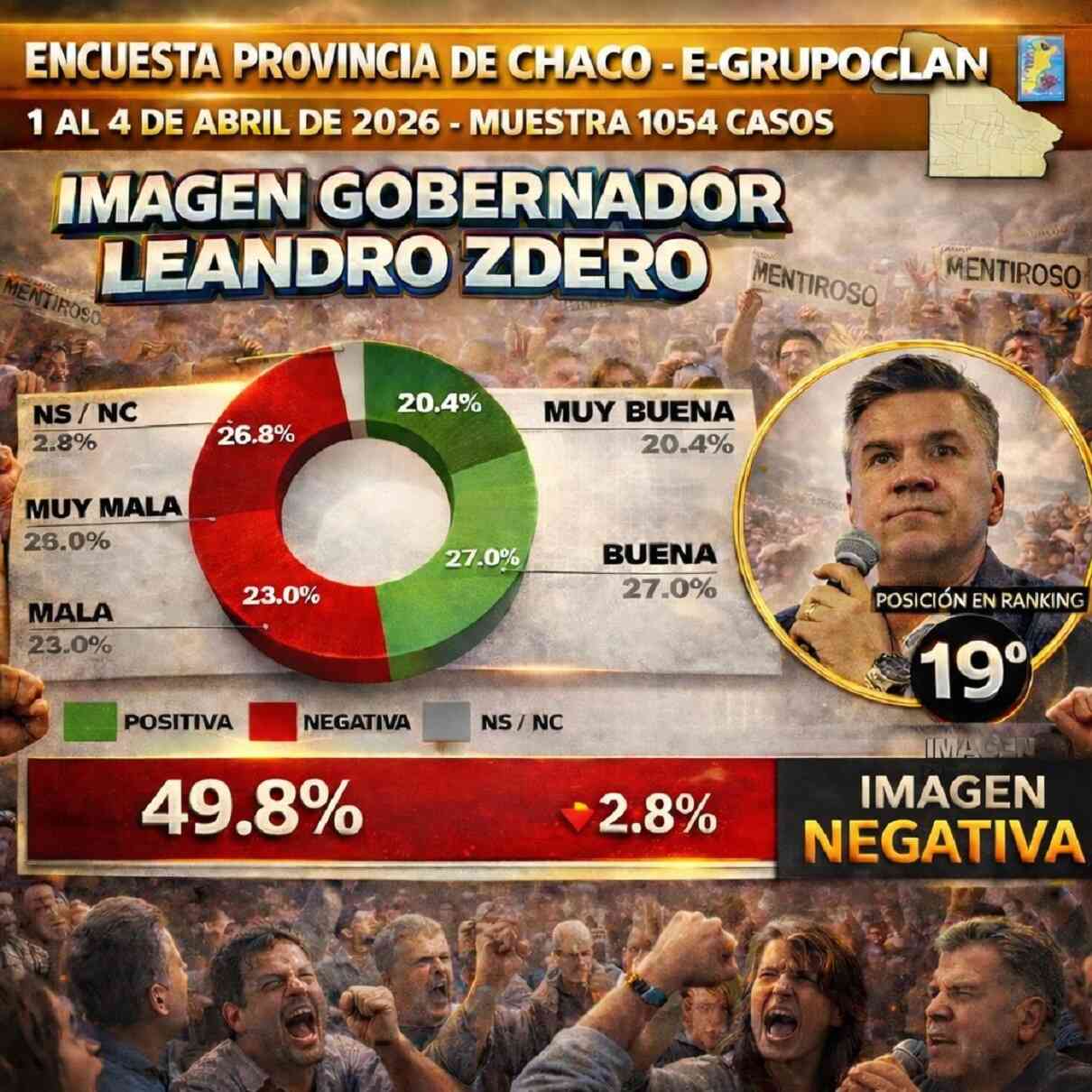 El escenario político chaqueño comienza a mostrar signos de tensión en torno a la figura del gobernador Leandro Zdero. Según el último informe de la consultora CB Global Data correspondiente al mes de abril, el mandatario provincial registró una caída en su posicionamiento dentro del ranking nacional de imagen, ubicándose en el puesto 19. El dato no solo refleja un movimiento estadístico, sino que expone una tendencia que podría tener implicancias en la dinámica política local.