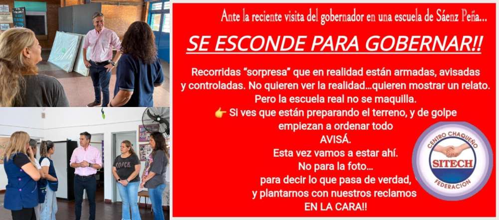 En medio de un creciente malestar en el ámbito educativo, sectores docentes salieron a cuestionar con dureza las recorridas “sorpresa” del gobernador Leandro Zdero por escuelas del interior chaqueño, particularmente tras su reciente visita a una institución en Sáenz Peña.